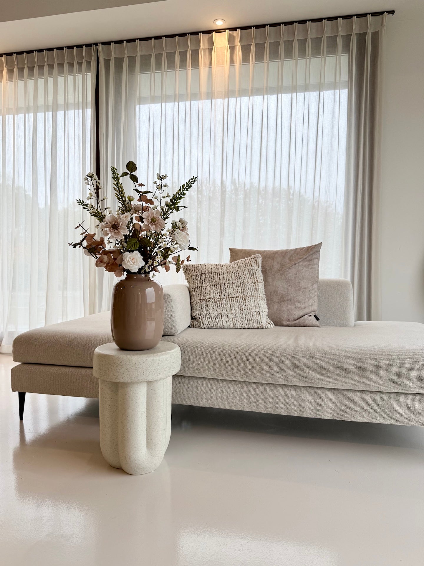 De warme bruine en beige tinten vormen een stijlvol en sereen geheel. De zachte beige bloemen en diepbruine accenten geven het boeket een rustige, chique en tijdloze uitstraling. Dit zijden boeket is samengesteld uit exclusieve bloemen van de hoogste kwaliteit, waaronder real touch bloemen die niet alleen levensecht lijken, maar ook verrassend echt aanvoelen. Dit prachtige zijden boeket brengt een gevoel van warmte, luxe en elegantie in huis.