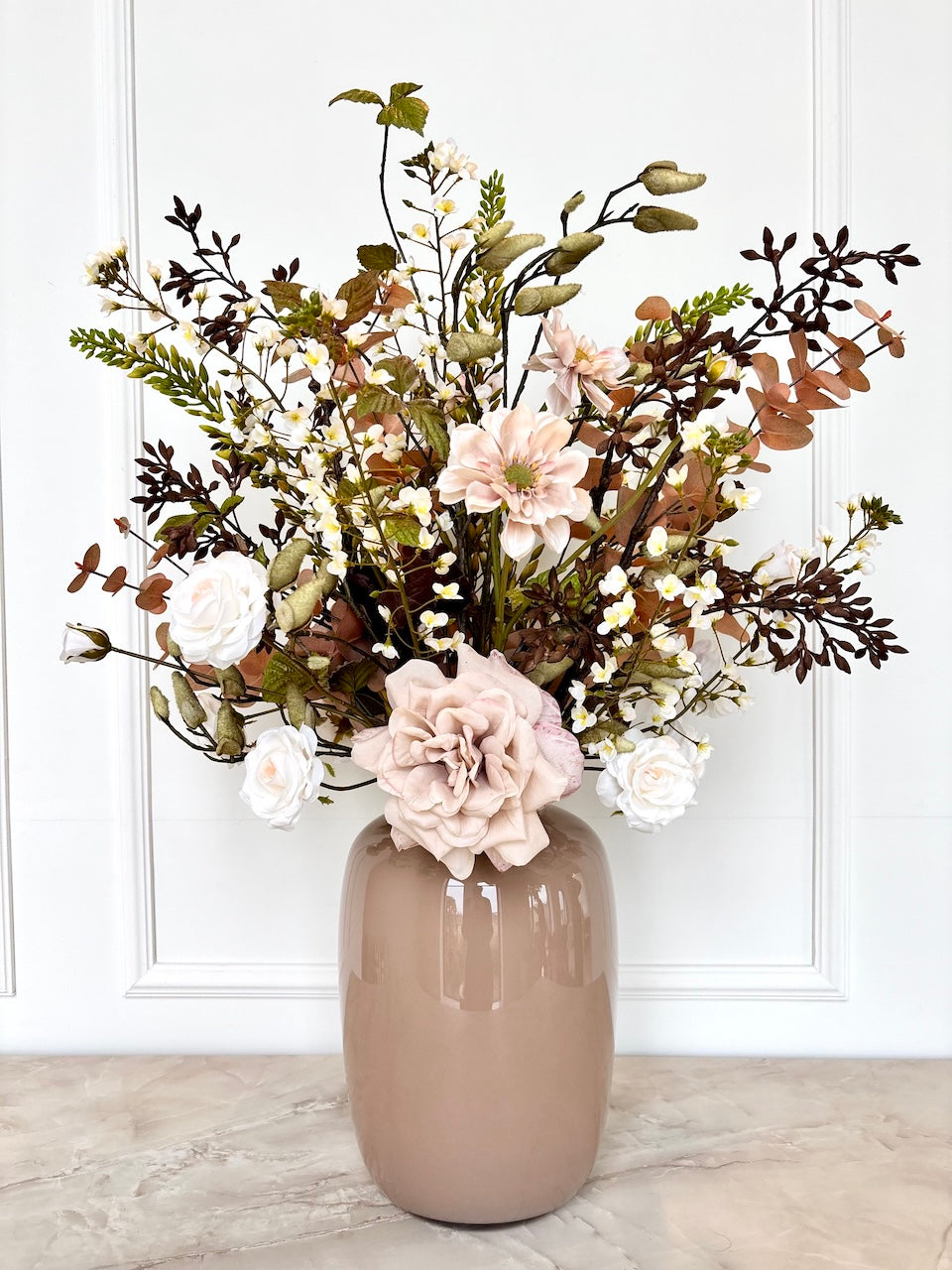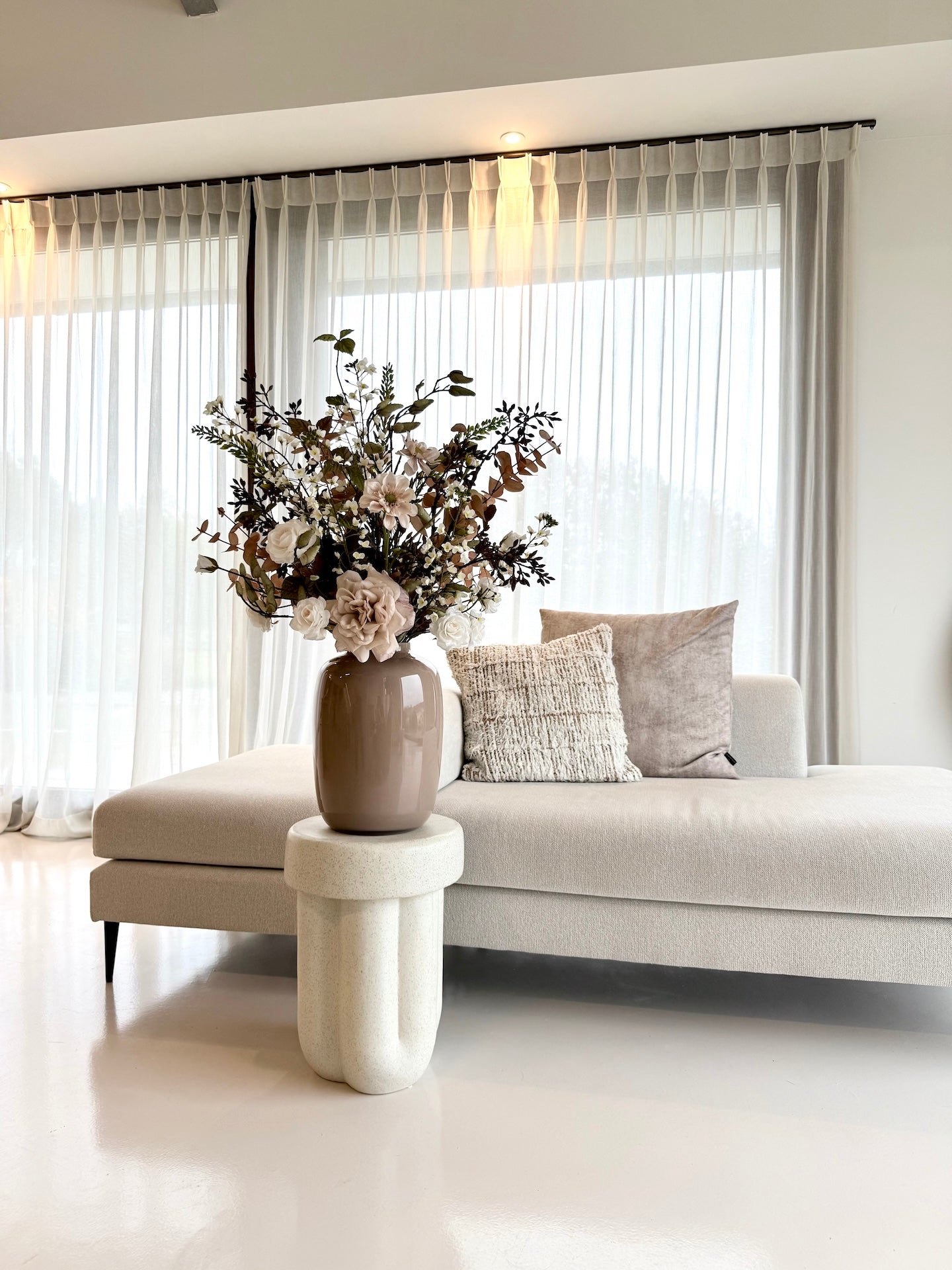 De warme bruine en beige tinten vormen een stijlvol en sereen geheel. De zachte beige bloemen en diepbruine accenten geven het boeket een rustige, chique en tijdloze uitstraling. Dit zijden boeket is samengesteld uit exclusieve bloemen van de hoogste kwaliteit, waaronder real touch bloemen die niet alleen levensecht lijken, maar ook verrassend echt aanvoelen. Dit prachtige zijden boeket brengt een gevoel van warmte, luxe en elegantie in huis.