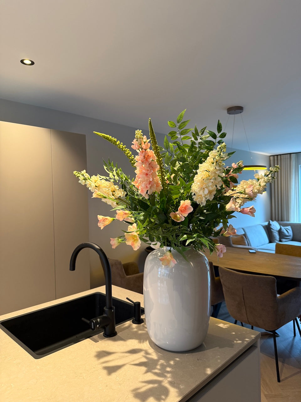 Breng rust en elegantie in je interieur met dit luxe zijden boeket. De zachte combinatie van fris groen, poederroze en creme kleurige bloemen zorgen voor een kalme en natuurlijke uitstraling. Perfect voor wie houdt van tijdloze luxe bloemen zonder onderhoud. Of je nu kiest voor een minimalistische woonkamer, een serene slaapkamer of een stijlvolle hal boeket Serenity voegt moeiteloos een vleugje harmonie toe aan elk interieur.