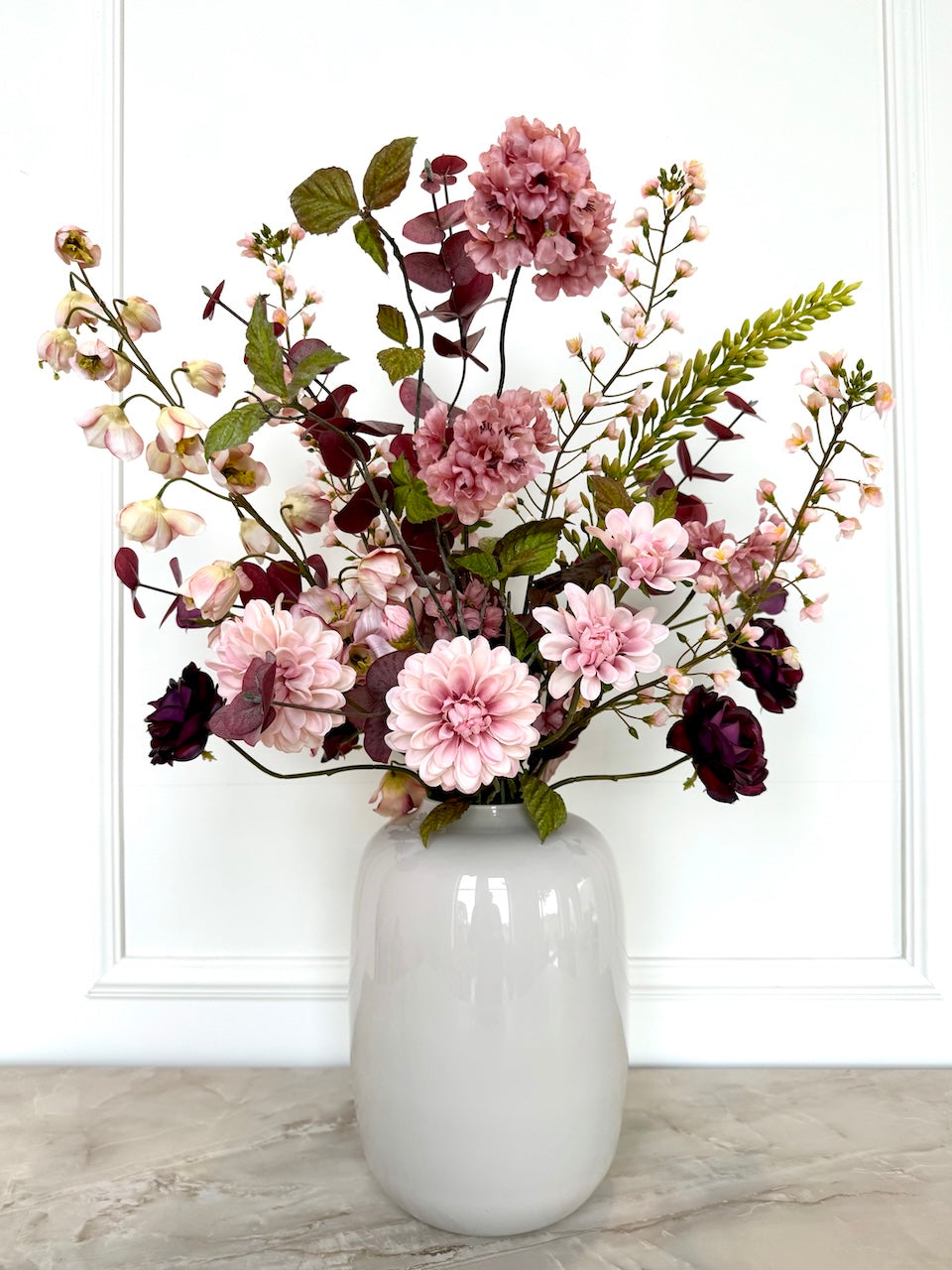 De diepe bordeaux tinten worden prachtig verzacht door de elegante oudroze bloemen, waardoor het boeket een rijke en chique uitstraling krijgt. Dit zijden boeket is samengesteld uit exclusieve bloemen van de hoogste kwaliteit, waaronder real touch bloemen die niet alleen levensecht lijken, maar ook verrassend echt aanvoelen. Dit prachtige zijden boeket brengt een gevoel van warmte, luxe en elegantie in huis.