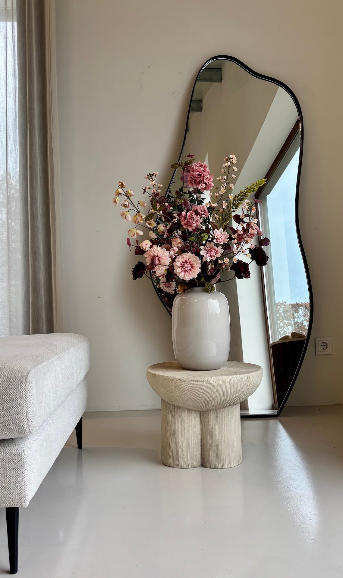 Het boeket is volledig rondom gevuld met zijden bloemen en is ongeveer 75cm hoog. Het boeket staat op de foto in een artic ivory vaas maat s (29cm hoog).