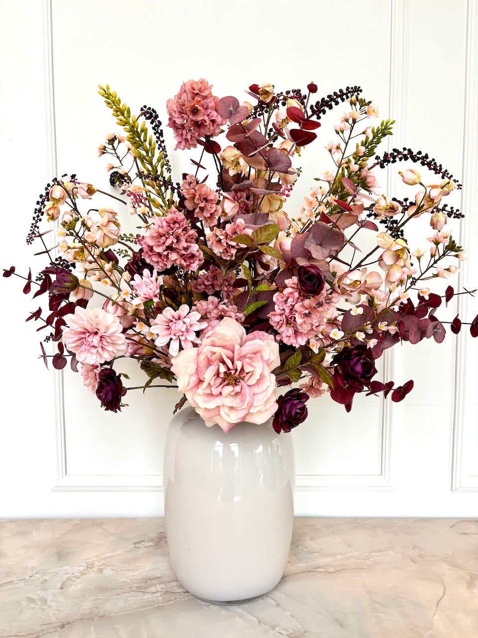 De diepe bordeaux tinten worden prachtig verzacht door de elegante oudroze bloemen, waardoor het boeket een rijke en chique uitstraling krijgt. Dit zijden boeket is samengesteld uit exclusieve bloemen van de hoogste kwaliteit, waaronder real touch bloemen die niet alleen levensecht lijken, maar ook verrassend echt aanvoelen. Dit prachtige zijden boeket brengt een gevoel van warmte, luxe en elegantie in huis.