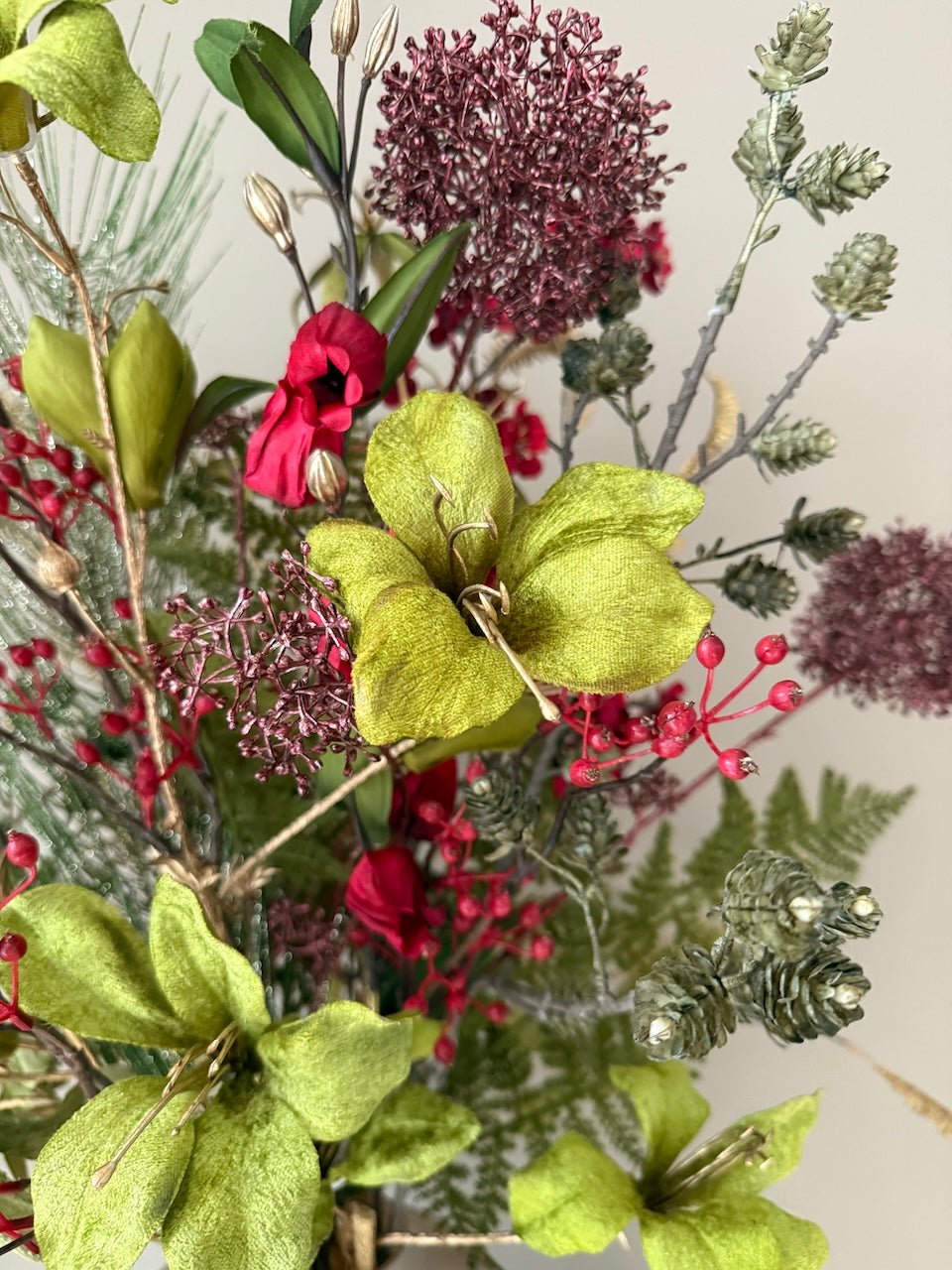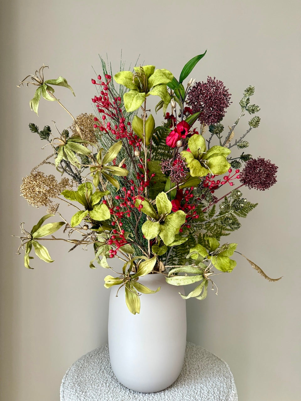 Het boeket staat op de foto in een artic beige mat vaas maat s en de totale hoogte is ongeveer 80cm.